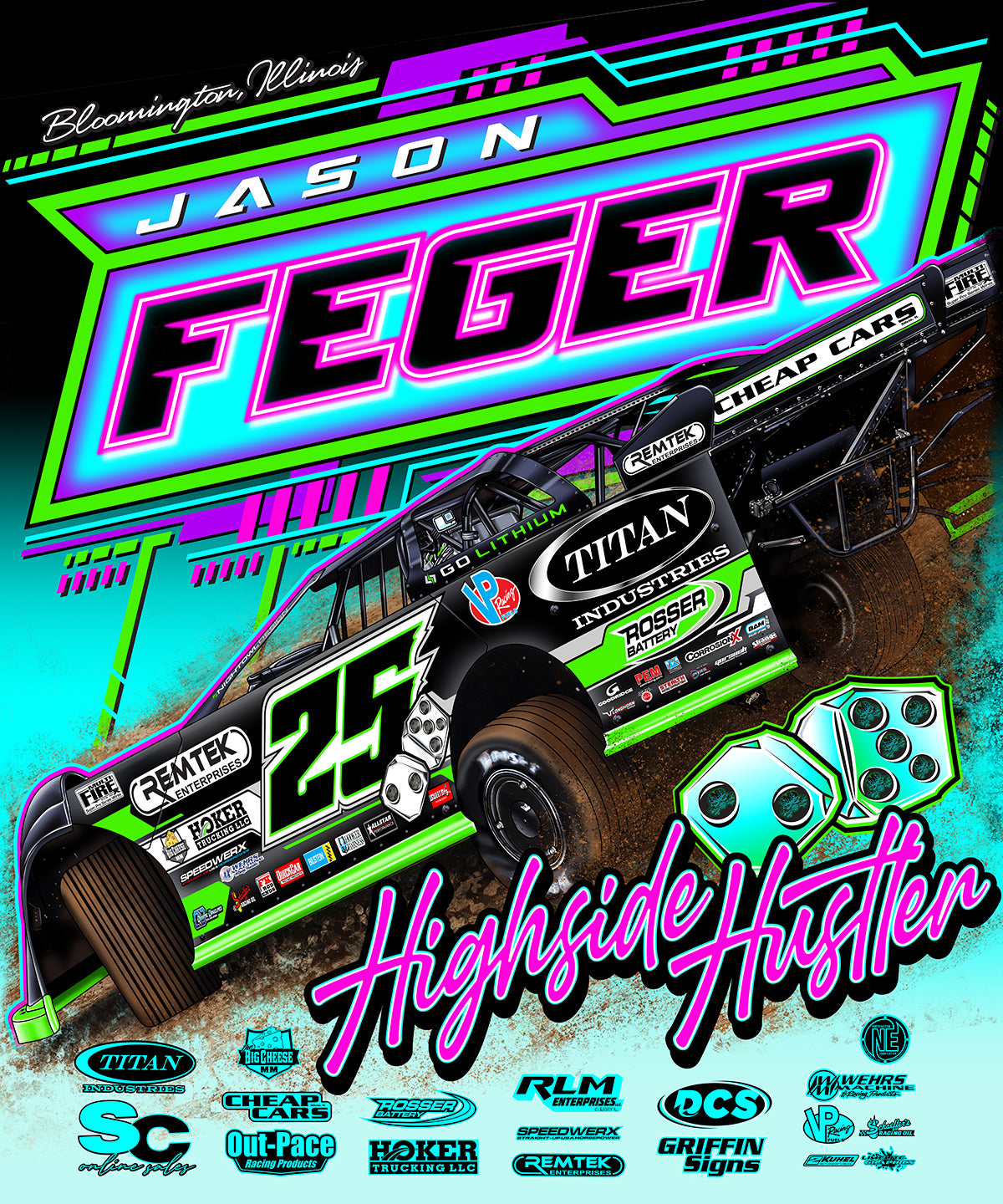Slingin' dirt and remember hot summer nights when it's frosty outside.  Features Feger's #25 late model slingin dirt, large tumblin dice, Highside Hustler, Jason Feger and a few key company logos who support the team.  🏁🔥