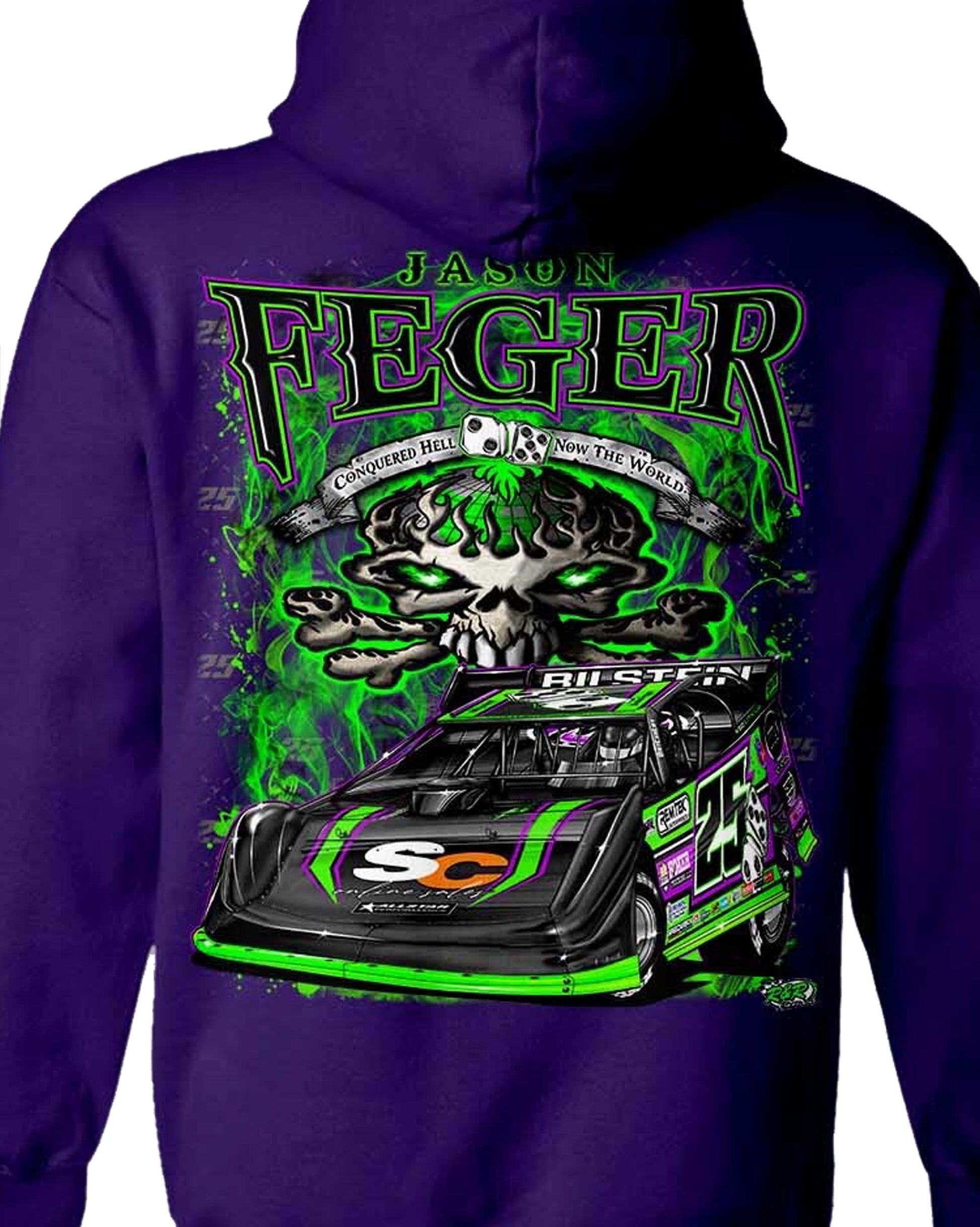 Conquered Hell, Now the World Feger's Hoodie - features Feger's iconic skull on flames in front of Eldora's famous globe for the World on front with banner reading Conquered Hell Now the World. Back features Feger's Dime's Reign car and Vulgar Display of Power.