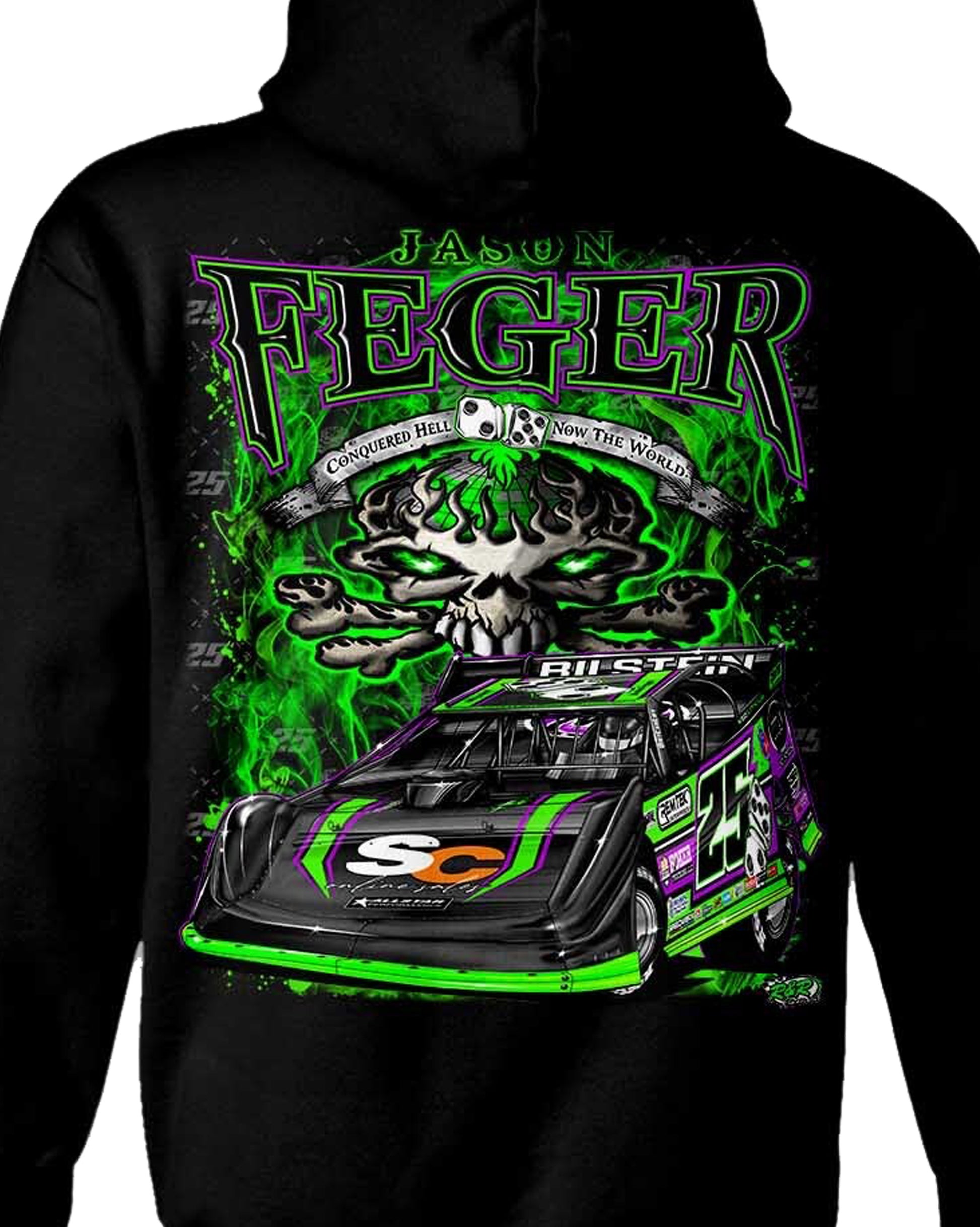 Conquered Hell, Now the World Feger's Hoodie - features Feger's iconic skull on flames infront of Eldora's famous globe for the World on front with banner reading Conquered Hell Now the World.   Back features Feger's Dime's Reign car and Vulgar Display of Power.