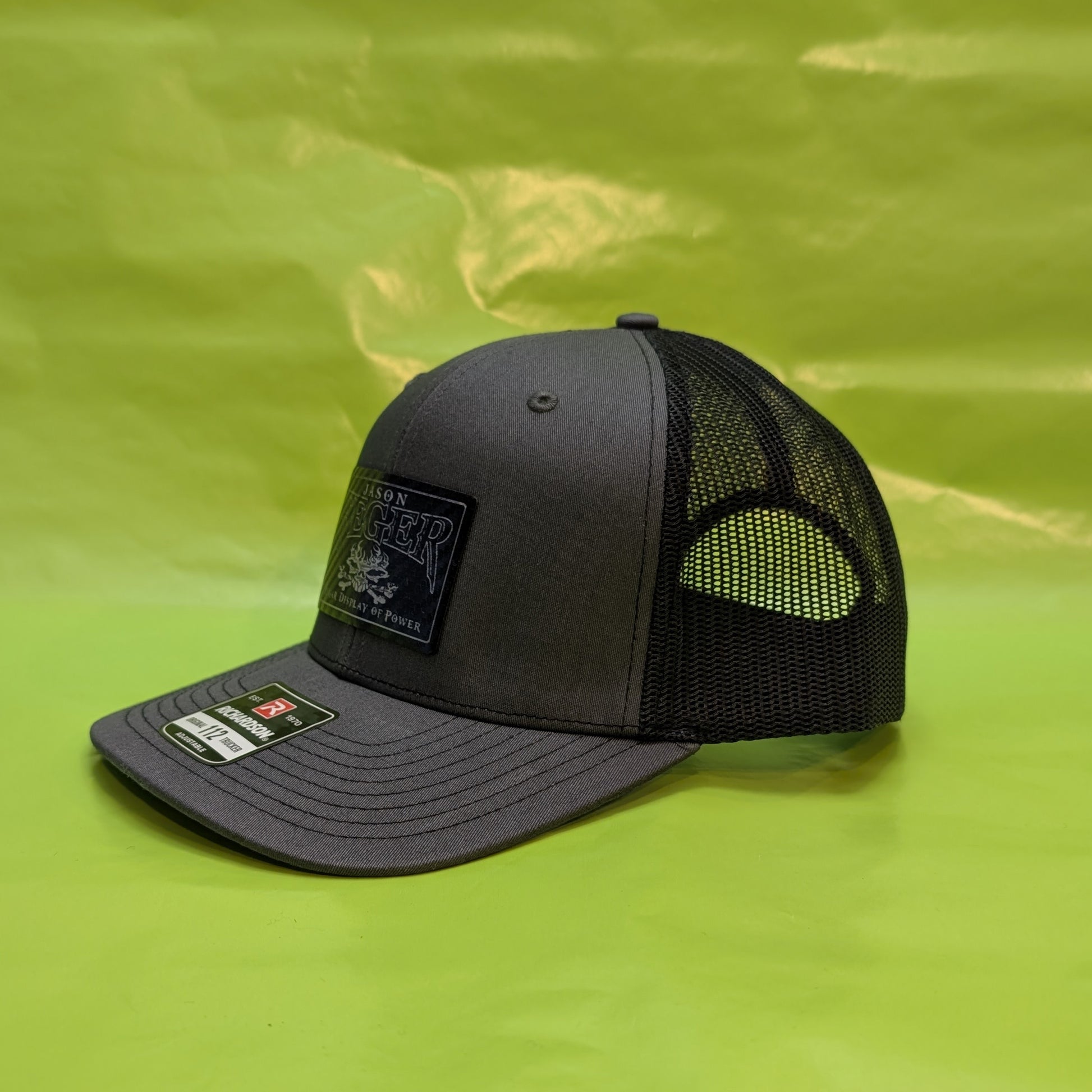 Black and silver patch with Jason Feger, Skull and Vulgar Display of Power on Richardson 112 Charcoal front with black mesh snap-back hat.