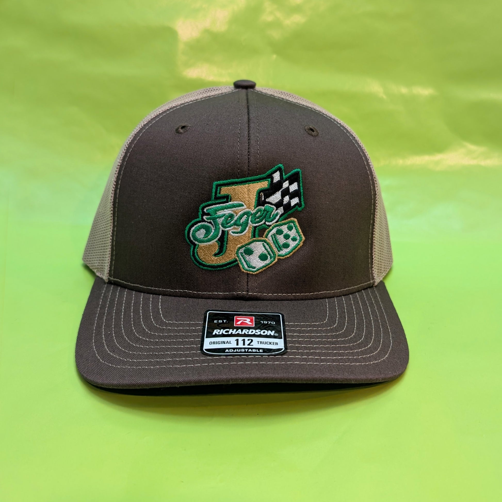 Tribute to Schrader with this JFeger tumblin' dice and checkered flag embroidery on a Richardson 112 snap back trucker cap.