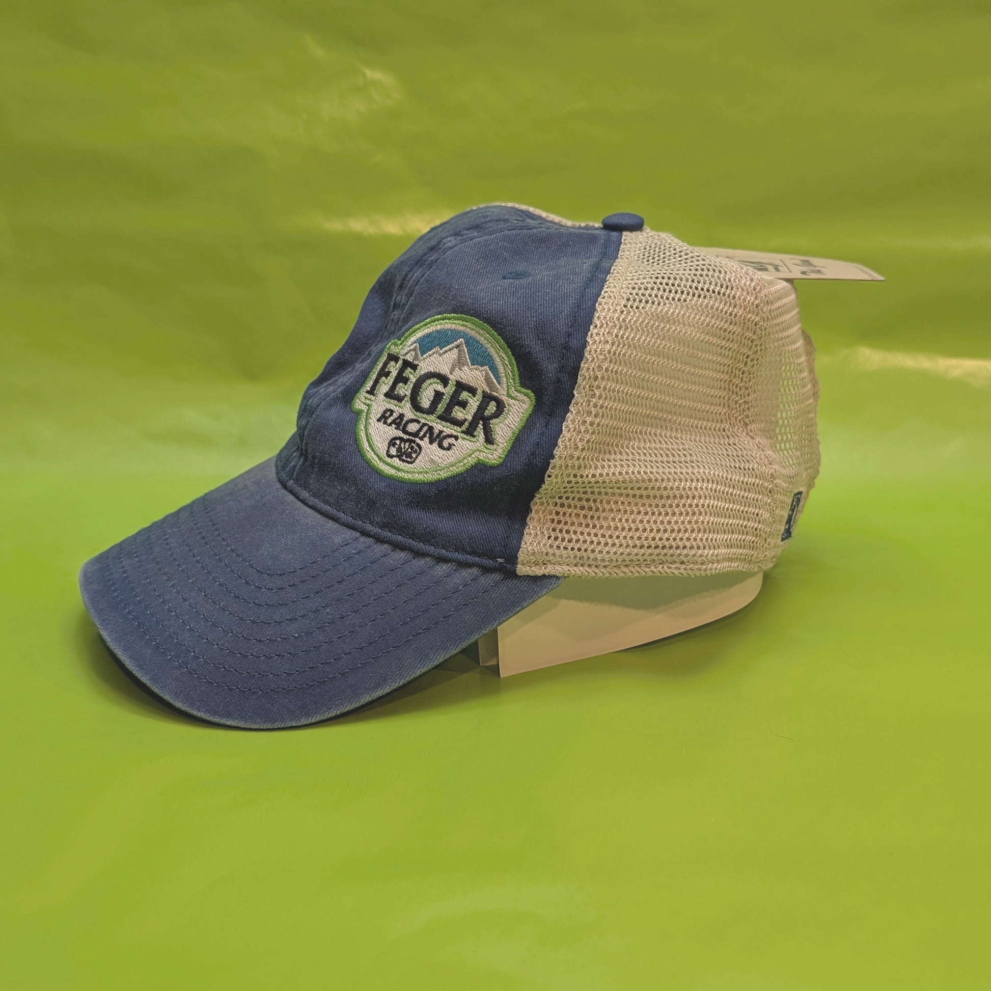 The best beer is a victory beer, FEGER RACING embroidery on the front of hat. Front is blue Jeans, off-white/taupe mesh back.