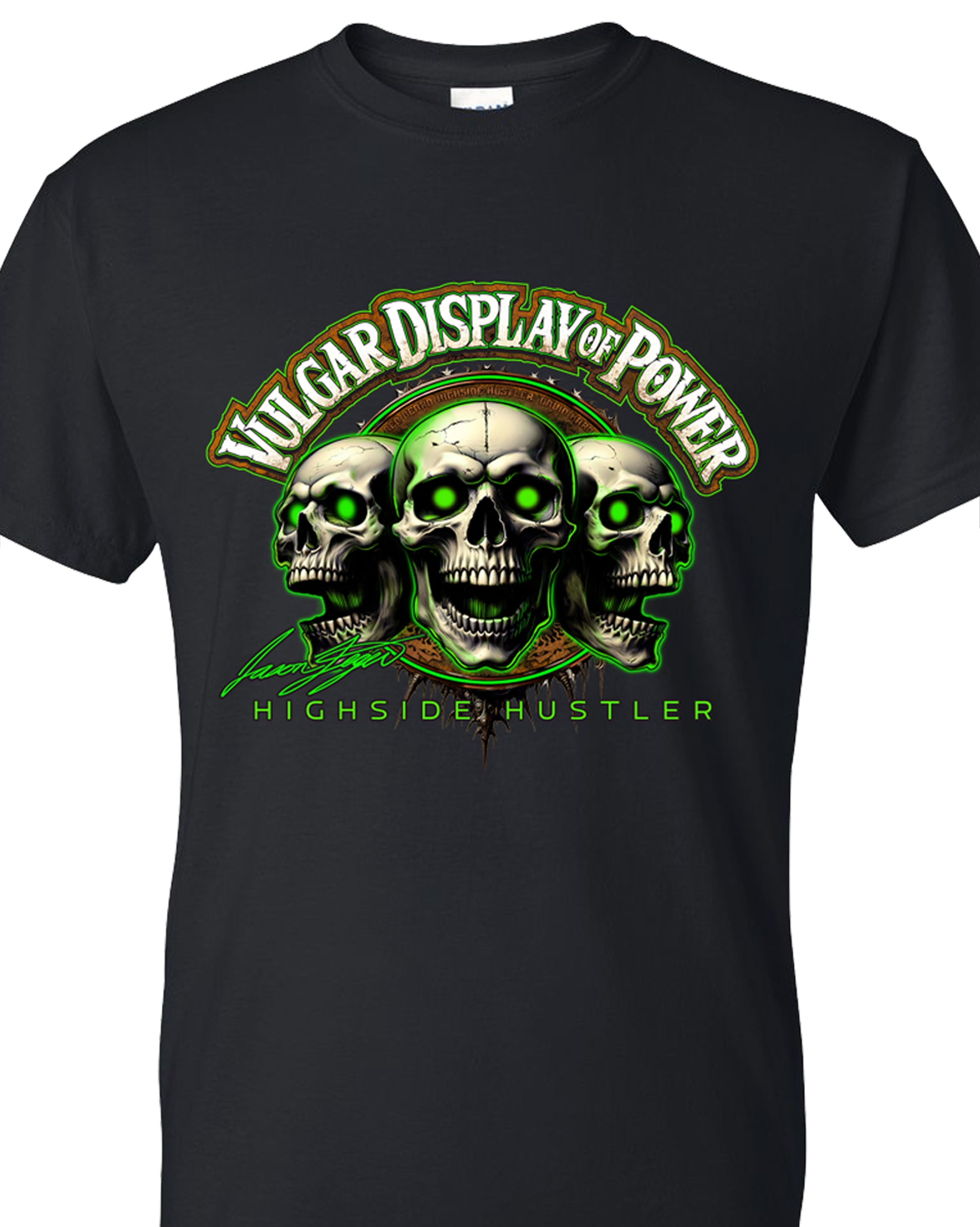 The front hits hard with a trio of sinister skulls and the bold declaration: VULGAR DISPLAY OF POWER. Beneath it, Highside Hustler and Jason Feger’s signature mark it with unmistakable identity.